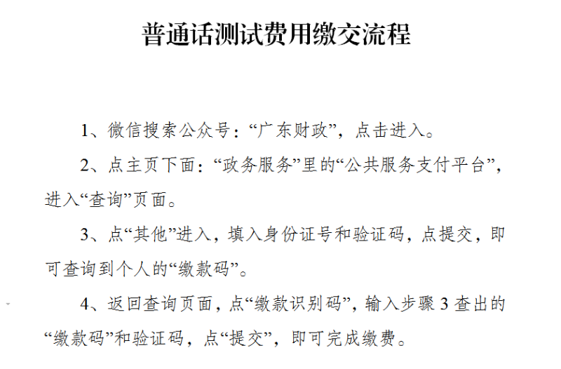 2.缴费时间为4月21日至4月30日,各预报名考生按照“普通话水平测试费用缴交流程”(见附件),在规定的时间内登录“广东公共服务支付平台”缴纳测试费用,缴费确认后报名才算完成,否则不能参加测试。考生缴纳测试费用后,因个人原因不参加测试,测试费用不予退还。