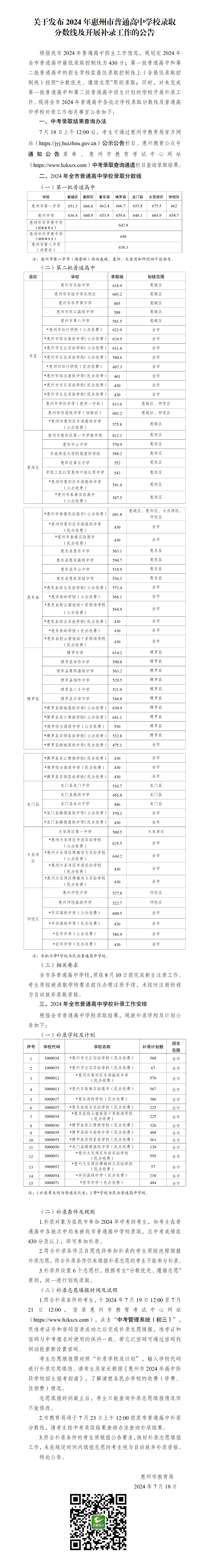 关于发布2024年惠州市普通高中学校录取分数线及开展补录工作的公告