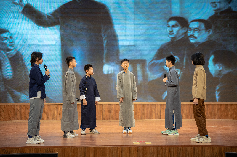 在此次初二年级开展的“名著剧场”活动中,同学们根据《红星照耀中国》书中毛泽东、周恩来、朱德等革命先辈的故事,自编出《红小鬼的故事》《周恩来二三事》《红军之父朱德》《少年毛泽东》《两把菜刀闹革命》《风雨长征路》等6个剧目,在创作的过程中加入了自己的演绎与诠释。